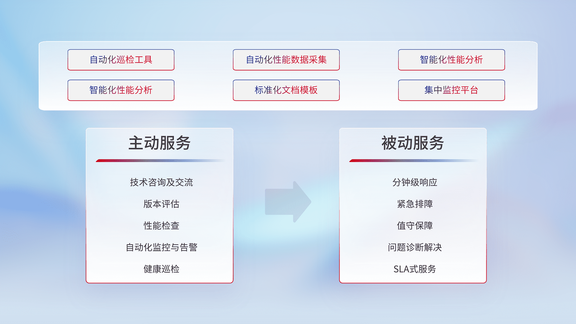 智能化工具和标准化文档,,,,保障服务质量,,提供主动服务(包含技术咨询、、版本评估、、性能检查、、自动化监控与告警、、、、健康巡检)和被动服务包含(分钟级响应、、紧急排障、、、、值守保障、、、、问题诊断解决、、SLA服务)。。