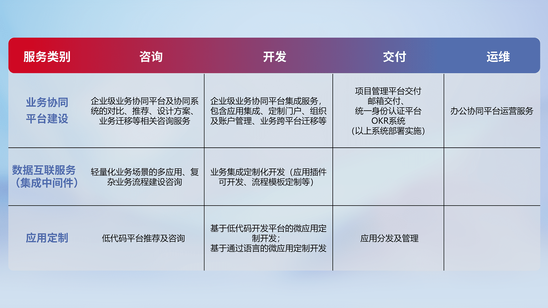 针对钉钉、、、企微、、、、IDaas等平台级产品提供产品的规划、、、、方案、、交付、、、、定制化开发等服务,,实现如统一协同办公、、、、智能客户服务、、混合会议管理、、、、智能数据查询、、等业务场景,,,实现数字化转型。。。